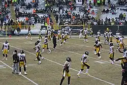 Ben Roethlisberger found Emmanuel Sanders on an 8-yard touchdown pass for a 13–7 score. On the ensuing kick-off, Mike Tomlin was standing just off the field along the Steelers' sideline as Baltimore's Jacoby Jones broke free on the return for a potential game breaking touchdown.[3] Tomlin, with his back to the approaching play, appeared to glance over his shoulder then place his foot briefly onto the field as he jumped out of the way, causing Jones to veer inside where he was tackled. Several Ravens players claimed Tomlin had intentionally interfered with Jones; if officials had agreed, a touchdown could have been awarded to the Ravens based on the palpably unfair act, no penalty was called. A week later the NFL fined Tomlin $100,000.[4]