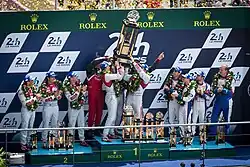 The top three finishers of each category appeared on the podium to collect their trophies and in a later press conference. All three of the No. 2 Audi drivers felt their turbocharger problem would have cost them the victory, with Lotterer saying, "When we had the turbo problem we were very disappointed because it's impossible to come back from that. We were a bit unlucky, but at Le Mans you never know what is going to happen and the team motivated me again – they did a great job."[71] Fässler added the team attempted to pressure Toyota but they were unable to catch the Japanese manufacturer: "But this time everyone had problems. We had to be flat out and have no penalties – it isn't easy to do that when you are pushing."[71] Tréluyer stated that winning Le Mans was "emotional" and praised the engineers strategy. He felt their approach was like their 2011 victory: "We concentrated on our own race and took the car through until morning. It was the car which had the least bad luck that won."[72] Kristensen stated he was not unhappy to finish in second and that while his team would have liked to have had their "little fairy tale" it was still a good result.[72] Di Grassi said it had been "a difficult race" for his team but hoped to return to Le Mans in the future while Gené revealed that did not expect a strong result but that second was "like a fairytale for me."[72]
