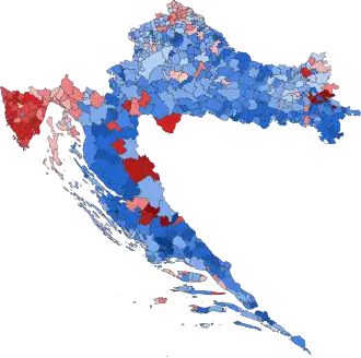 | HDZ—>80% HDZ—70–80% HDZ—60–70% HDZ—50–60% HDZ—40–50% HDZ—<40% | SDP—>80% SDP—70–80% SDP—60–70% SDP—50–60% SDP—40–50% SDP—<40% | SZH—40–50% SZH—<40% Labour—<40% |