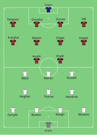Queens Park Rangers started the second half and in the 51st minute, a Ward pass was put out for a corner by Dunne which was subsequently cleared by Danny Simpson. Two further corners followed but with no end product, as the game remained goalless. In the 57th minute, Doyle passed to Traore whose pull back found Austin who struck the ball wide of the post from 12 yards. It was Doyle's last involvement as he was then replaced by Bobby Zamora in QPR's second substitution of the afternoon. In the 60th minute, O'Neil was shown a red card for fouling Russell as he was about to shoot. Soon after, to bolster the QPR midfield, Clint Hill was replaced by Karl Henry. Derby made their first substitutions of the game, with Bryson on for Hughes and Simon Dawkins replacing Russell. Two minutes later Bryson forced Green to make a low save, then Martin's shot from a Bryson pass needed the QPR goalkeeper to make a reaction save from the corner of the six-yard box. Hendrick drew another save from Green in the 75th minute, the rebound from Ward being blocked by teammate Martin. Another Hendrick shot in the 87th minute went straight to Green and in the last minute of regular time, QPR's Zamora curled a shot past Grant to make the score 1–0. Three minutes of injury were indicated, and in the last of those, Bamford came on for Ward and his attempted overhead kick was deflected behind by Barton. Derby goalkeeper Grant came up for the corner which was kicked out for a throw by Keogh, and a minute later the final whistle was blown, QPR winning the match 1–0.[19]