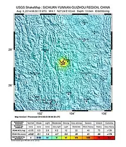 The 2014 Ludian earthquake struck Ludian County, Yunnan, China, with a moment magnitude of 6.1 on 3 August.[6] The earthquake killed at least 615 people, injuring at least 2,400 others. At least 114 people remained missing.[9] Over 12,000 houses collapsed and 30,000 were damaged.[10] According to the United States Geological Survey, the earthquake occurred 29 km (18 mi) west-southwest of Zhaotong city at 16:30 local time (08:30 UTC).[11][12][13]