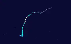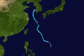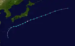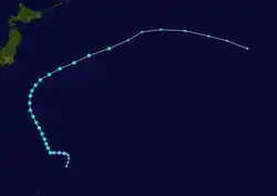 On February 27, the JMA started to monitor a tropical disturbance, that had developed, about 630 km (390 mi) to the south-southeast of Hagåtña, Guam.[28] During the following day, it was upgraded by the JTWC to a tropical depression, and designated as 03W.[29][30] Several hours later, the JMA upgraded the system to a tropical storm and named it Faxai.[31][32] Faxai began to rapidly intensify into a severe tropical storm, and then typhoon, for a short period of time on March 4.[33][34][35] The system transitioned into an extratropical cyclone during March 6, before it dissipated during March 8, while located around 800 km (495 mi) to the northeast of Wake Island.[28]