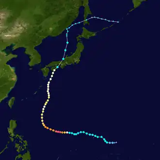 Early on April 27, the JMA reported that a tropical depression had formed about 420 km (260 mi) to the south-southeast of Hagåtña, Guam.[47] Later that day, the JTWC upgraded it to Tropical Depression 06W as it moved north.[48] Due to warm waters, the system rapidly intensified into a tropical storm with the JMA naming it Tapah on April 28.[49][50] Later that day, convection occurred and the system was upgraded to a severe tropical storm.[51] Early on April 29, the JTWC upgraded Tapah into a minimal typhoon.[52] It weakened back to a tropical storm during April 30.[47] During May 1, the system weakened into a tropical depression because of the effects of strong vertical windshear and a decrease in sea surface temperatures, before the JTWC issued their final advisory on the system.[47][53] The system was subsequently last noted by the JMA during the next day, as it dissipated over 1,300 km (810 mi) to the south-east of Tokyo, Japan.[47]