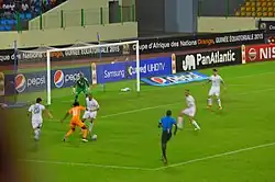 Ghana's quarter-final took place in Malabo against Guinea, on 1 February 2015.[15] Against a team described by reporters for BBC Sport as "poor", Ghana scored their opening goal after 4 minutes as Atsu kicked the ball into the goal from Ayew's back-heeled pass. They added a second goal just before half time, Kwesi Appiah scoring after a failed clearance by Guinea's Baïssama Sankoh. Atsu scored again on 61 minutes to complete a 3–0 win for Ghana.[16] Their semi-final match took place four days later, also in Malabo, against hosts Equatorial Guinea. Referee Eric Otogo-Castane awarded Ghana a penalty after 41 minutes for a foul on Appiah, which was vociferously disputed by Equatorial Guinea. Ayew scored the penalty, and Equatorial Guinea attempted to restart the game, but Otogo-Castane ordered them to wait until Ghana had finished celebrating. The home supporters began throwing bottles towards Ghana's substitutes on the sideline. Ghana doubled their lead through Wakaso just before half time and then added a third through Ayew on 75 minutes. At this point, the match had to be delayed for 40 minutes as the Equatorial Guinea supporters began an attack on the Ghana supporters. The police responded by sending a helicopter, which flew within 30 feet (9 m) of the crowd and deployed smoke bombs. The Ghana team's Twitter feed later likened the events to "a war zone". Play eventually resumed and with no further goals scored, Ghana completed a 3–0 win.[17]