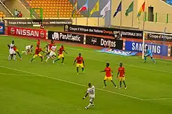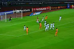Ghana had the first opportunity to score in the second half on 52 minutes, when Harrison Afful passed the ball to Atsu on the right-hand side following a mistake by Ivory Coast, who in turn passed to Gyan in the centre. His shot went over the goal.[31][32] Neither side had many chances in the second half, the midfield dominating the attackers on both sides.[32] There were also many fouls by both sides.[31] Ghana won a free kick on 68 minutes, after a handball by Dié, which was taken by Wakaso and headed just wide of the goal by Boye.[31] Two minutes later, Wakaso himself took a shot from 30 yards (27 m) out but it went high over the crossbar.[31][32] A run down the right flank by Atsu gave Ghana another attack one minute after that, but Gyan's shot from the resulting pass was blocked by Ivory Coast.[32] Ivory Coast had a chance on 82 minutes, when Bony headed over the crossbar from a Tiene cross.[31] They then had two opportunities to win the game in the final minute, first with a block by Razak which fell to Doumbia, who was unable to convert, and then when Razak fumbled the ball following an Aurier cross, but it did not reach any Ivorian players.[31][32] The match remained 0–0 at the end of normal time, which meant 30 minutes of extra time was played.[33]