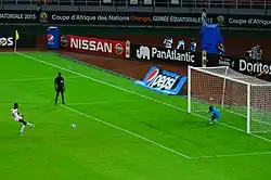 Ghana's Wakaso took the first penalty of the shoot-out and scored, hitting the ball to the opposite side of the goal after Barry had dived to his left. Bony then missed his penalty for Ivory Coast, his shot hitting the crossbar. Ayew followed for Ghana and scored, and then Tallo, who had not touched the ball since coming on as a late substitute, missed for Ivory Coast, hitting his shot wide.[31] The score was 2–0 to Ghana with both teams having taken two.[33] Ghana then missed their next penalty, as Acquah's shot was saved by Barry. Aurier scored for Ivory Coast, and then Ghana missed again, Acheampong sending his left-footed shot wide of the goal. Doumbia scored for Ivory Coast to level the shoot-out at 2–2, and then Ayew and Yaya Touré both scored to give a score of 3–3 after the regulation five kicks.[31]