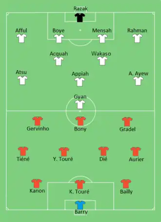 Ivory Coast won an early corner kick, but it was cleared by Appiah with Serey Dié's long-range follow-up easily blocked.[31] Yaya Touré had the first chance to score in the game on 12 minutes; he cleared the wall with a free kick, but the shot went straight to Ghanaian goalkeeper Brimah Razak, who caught it.[31][32] This eventually proved to be the only shot on target in the entire match.[31][33] Ivory Coast had another chance shortly afterwards, when Gradel shot wide following a pass from Gervinho, but the sides were relatively equal in the opening. Ghana's players made a series of long passes intended to reach Atsu, but Ivory Coast were able to defend all of these. Dié received the first booking of the evening on 15 minutes for a studs-first foul on Wakaso. Gyan then stamped on Eric Bailly's toes on 22 minutes in an off-the-ball incident, but no foul was given. Atsu had the best chance of the game on 25 minutes, when he hit the goalpost from 30 yards (27 m) from an Ayew pass.[31][34]