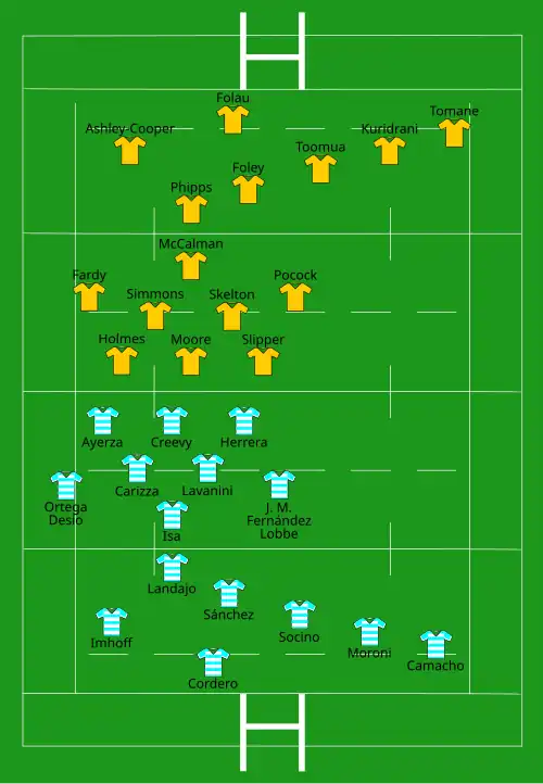 | Pen: Sánchez (3/3) 29', 40', 57' | Report[9] | Try: Tomane 16' m Mumm 58' m Kuridrani 77' c Ashley-Cooper 78' m Con: Foley (1/4) 77' Pen: Foley (4/5) 39', 42', 53', 69' |