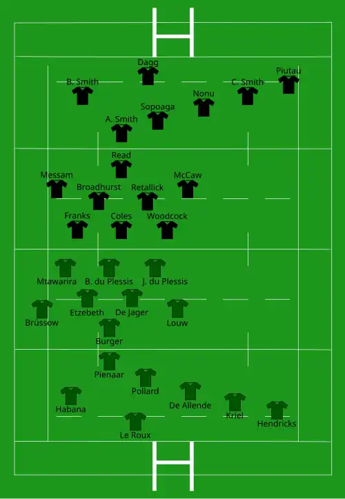 | Try: Le Roux 9' c Kriel 45' c Con: Pollard (2/2) 10', 46' Pen: Pollard (2/3) 20', 56' | Report[8] | Try: B. Smith 39' c Coles 48' c McCaw 73' c Con: Sopoaga (3/3) 40', 49', 74' Pen: Sopoaga (2/4) 2', 80' |