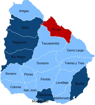 In the municipal elections of May 2010, the Partido Nacional (National Party) had won 12 departments, the Partido Colorado (Colorado Party) two departments, and the Frente Amplio (Broad Front) five departments.