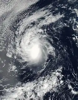 On June 27, the NHC began to monitor a tropical wave moving over Central America for possible development.[30] A low-pressure area formed south of Mexico on June 30,[31] and early on July 3, the storm gained enough organization to be designated Tropical Depression Three-E.[32] Six hours later, amid a favorable environment with warm sea surface temperatures and decreasing vertical wind shear, it intensified into Tropical Storm Blas.[33] Steady strengthening ensued, and Blas intensified into a hurricane on July 4.[34] Intensification stalled for the remainder of that day as dry air wrapped into the circulation;[35] however, Blas began to rapidly deepen on July 5, and it became the first major hurricane of the season that evening.[36] Blas quickly reached peak intensity at Category 4 strength on July 6.[37] Blas weakened to a Category 3 hurricane soon after, before transitioning into an annular tropical cyclone and maintaining intensity.[38] However, Blas soon passed over decreasing sea surface temperatures, resulting in a slow weakening trend; Blas weakened below major hurricane status late on July 7,[39] and down to a Category 1 hurricane by the next day.[40] Blas further degraded to a tropical storm on July 9,[41] as weakening accelerated amid a stable air mass and increasing southwesterly shear.[42] Over sea surface temperatures of 24 °C (75 °F), Blas weakened to a tropical depression on July 10,[43] and degenerated into a post-tropical cyclone soon after.[44]