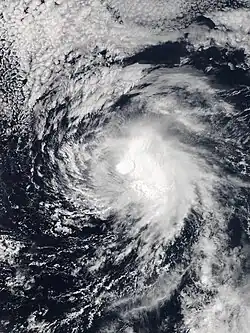 A powerful and long-lived westerly wind burst—a feature commonly associated with strong El Niño events—spurred cyclogenesis within a persistent low-latitude, west-to-east oriented surface trough, resulting in the formation of an area of low pressure on January 6.[10] Fueled by unusually high sea surface temperatures, estimated at 29.5 °C (85.1 °F), the system gradually coalesced into a tropical depression on January 7.[9] A ridge aloft centered directly overhead the system enhanced its poleward outflow, enabling the development of deep convection around its center, which soon strengthened into a tropical storm receiving the name Pali, becoming the earliest such system in the northeastern Pacific on record.[10][11] Pali continued intensifying through the first half of January 8 and nearly reached hurricane strength, but easterly vertical wind shear caused by the ridge disrupted its center, causing it to start weakening and move northwestward.[10] Steady weakening continued through January 9 as Pali's deep convection was displaced to the west of its low-level center and intermittently pulsed, later leading to a dramatic decrease in intensity.[10] By the end of that day, Pali barely maintained tropical storm strength, and the lack of persistent deep convection permitted it to be less affected by the easterly wind shear, causing its forward motion to decrease significantly.[10] As the ridge weakened and retreated southward on January 10, causing vertical wind shear to gradually diminish, Pali started re-intensifying, with persistent deep convection redeveloping near its center and within its western quadrant.[10] On January 11, the ridge passed directly over Pali, leading to the reestablishment of poleward outflow and eventual development of southwesterly flow, enabling its convection to slowly increase in coverage and organization within all quadrants and establishing a northeastward movement.[10]