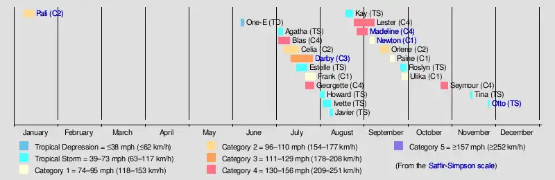 The 2016 Pacific hurricane season was tied as the fifth-most active Pacific hurricane season on record, alongside the 2014 season. Throughout the course of the year, a total of 22 named storms, 13 hurricanes and six major hurricanes were observed within the basin. Although the season was very active, it was considerably less active than the previous season, with large gaps of inactivity at the beginning and towards the end of the season. It officially started on May 15 in the Eastern Pacific (north of the Equator and east 140°W), and on June 1 in the Central Pacific (from 140°W to the International Date Line); they both ended on November 30.[1] These dates conventionally delimit the period of each year when most tropical cyclones form in these regions of the Pacific Ocean. However, tropical development is possible at any time of the year, as demonstrated by the formation of Hurricane Pali on January 7, the earliest Central Pacific tropical cyclone on record.[2] After Pali, however, no tropical cyclones developed in either region until a short-lived depression on June 6. Also, there were no additional named storms until July 2, when Tropical Storm Agatha formed, becoming the latest first-named Eastern Pacific tropical storm since Tropical Storm Ava in 1969.[3]