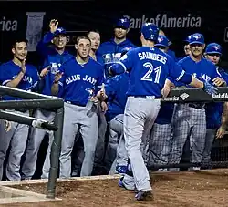 Shortly after pitchers and catchers reported to Dunedin for the start of spring training on February 22, José Bautista addressed the media regarding his contract situation. Bautista, in the final year of a five-year, $65 million contract, stated that he had told the Blue Jays the length of contract he was seeking as well as the compensation of said contract, and that he would not negotiate or agree to a "hometown discount".[48] The following day, TSN's Rick Westhead reported that Bautista had requested a five-year, $150 million contract.[49] The report was later refuted by Bautista.[50] While Bautista's contract situation was unfolding, the Blue Jays, Los Angeles Angels of Anaheim, and Cincinnati Reds were reported to be in agreement on a trade that would have sent Michael Saunders to the Angels, Jay Bruce to the Blue Jays, and unnamed prospects from the Angels and Blue Jays to the Reds. Hours after the trade was made public, reports surfaced that the deal was on hold due to issues with an unknown player's physical.[51]