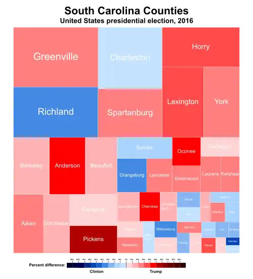 Out of 3.12 million registered voters, 2.10 million voted, a turnout of 67.86%.[1] Trump continued the Republican tradition in South Carolina, carrying the state with 54.9% of the vote. Clinton received 40.7% of the vote, underperforming Barack Obama's 2012 performance by about 4%.[2] Trump became the first Republican to win the White House without carrying Charleston County since Dwight Eisenhower in 1956.