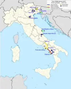 The route for the 2017 Giro d'Italia Femminile was announced on 12 April 2017.[7] The total race distance of 1,008 km (626 mi) was the longest since 2001, with the previous 15 editions of the race all under 1,000 kilometres (620 mi) in length.
