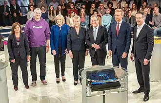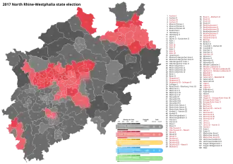 The 2017 North Rhine-Westphalia state election was held on 14 May 2017 to elect the members of the Landtag of North Rhine-Westphalia. The incumbent coalition government of the Social Democratic Party (SPD) and The Greens led by Minister-President Hannelore Kraft was defeated. The Christian Democratic Union (CDU) became the largest party and formed a coalition with the Free Democratic Party (FDP). CDU leader Armin Laschet was subsequently elected Minister-President.[1][2]