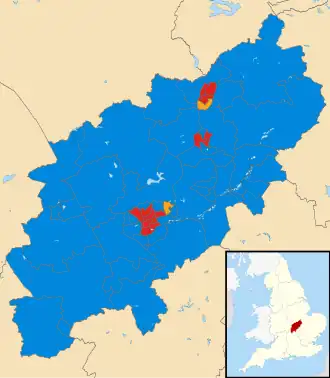 The 2017 Northamptonshire County Council election took place on 4 May 2017 as part of the 2017 local elections in the United Kingdom.[3] County councillors were elected from all 57 electoral divisions which returned one county councillor to Northamptonshire County Council by first-past-the-post voting for a four-year term of office. These elections were the last held for Northamptonshire County Council before its dissolution in 2021.
