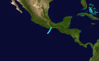 On May 5, the National Hurricane Center (NHC) indicated that an area of low pressure was forecast to form south of Mexico over subsequent days, with the possibility of tropical cyclone development thereafter.[13] A broad cyclonic circulation began to develop as expected late on May 7,[14] gradually organizing into the season's first tropical depression by 21:00 UTC on May 9, while located about 545 mi (875 km) south-southeast of Salina Cruz, Mexico.[15] The depression intensified into Tropical Storm Adrian six hours later.[9] Initially, forecasts expected the small storm to intensify into a powerful hurricane. Shortly after reaching peak intensity early on May 10, an unexpected increase in mid-level wind shear caused Adrian to quickly weaken and degenerate to a remnant low by 00:00 UTC on May 11.[16] Adrian's remnant low persisted for another day, before dissipating on May 12.[16]