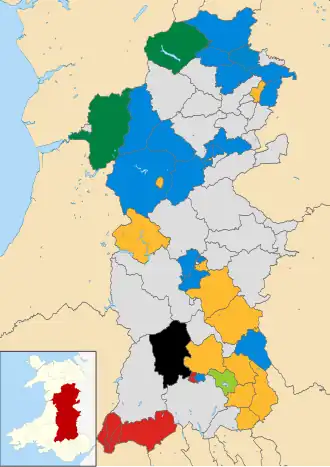 ![]() Map of the results of the 2017 Powys County Council election. Yscir (in black) initially received no nominations and was therefore vacant after the election, it was later won by the Conservatives. | |||||||||||||||||||||||||||||||||||||||||||||||||||||||||||||||||||||||||||||||||||||||||||||||||||||