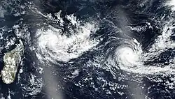 Two storms emerged in the month of December: Kenanga and Cilida. The former entered the basin from the Australian region on 16 December,[19] whereas the latter developed from the monsoon trough to a tropical depression two days later.[20][21] Kenanga attained intense tropical cyclone status on 18 December,[22] as Cilida headed towards Mauritius. Simultaneously on 20 December, both storms were tropical cyclones within the basin, the first such case since the 2013–14 season.[23] Also peaking as an intense tropical cyclone,[21] Cilida brought slight impact towards Mauritius.[24][25] Both storms then weaken and had dissipated by 24 December.[22][21]