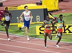 On the final lap, Jakob Ingebrigtsen made an early, aggressive move to the front. Chelimo attempted to stay with him. Ahmed, Barega, and Edris were all wise to this error, and did not challenge Ingebrigtsen as aggressively as Chelimo did. Barega and Edris passed Ahmed as they began winding up their pace in preparation for their final attack. As Ingebrigtsen and Chelimo began running out of steam off of the final bend, Barega passed them first, with Edris coming wide on the outside. Edris sprinted past Barega to defend his title, with a final lap of 55 seconds. Ahmed and Bekele passed Ingebrigtsen and Chelimo for the third and fourth place, respectively. Evidently suffering from his early move, Jakob Ingebrigtsen was slowing rapidly, and dove at the finish line for a very close fifth place. He then laid on the track, visibly exhausted.