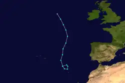 Storm Clement was named by AEMET on 27 November. It was located near the Azores Islands when it was named. By 28 November, Clement had moved slightly farther south and was affecting the Canary and Madeira Islands.[39] The storm stalled, keeping the worst conditions away from mainland Europe. Portugal and some parts of Western Spain did see Clement's outer bands.[40] The NHC was also monitoring the system for tropical or subtropical development. After stalling for about 4 days, the system dissipated on 2 December.[41][42]