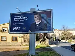 One of HDZ BiH's campaign posters featuring mayoral candidate Mario Kordić. The slogan Investments, economy, jobs is positioned above the party's logo