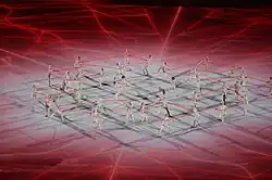 The first performance of the ceremony, designed "[showcase] Japan's forte in digital art and projection mapping technology,"[63] featured a digital graphics projection on the stadium floor, at the centre of which nurse and boxer Arisa Tsubata, who won a national championship only two years after taking the sport,[64] but was unable to participate as an athlete after being eliminated in the first round of the Asia & Oceania Boxing Olympic Qualification tournament held prior to the pandemic and the games' postponement, jogged on a treadmill,[65][66] then was joined by performers on an exercise cycle, rowing machine, running in place, while performers abstract danced and coloured ball of light were projected,[65] "symbolising the athletes' plight in training during the pandemic for this event."[63] A dance presentation was performed with dancers wearing white outfits connected by red strings, meant to "portray the inner workings of the body and heart."[67]
