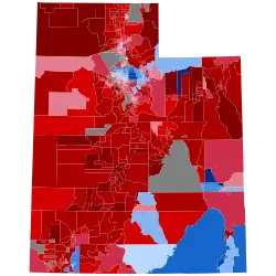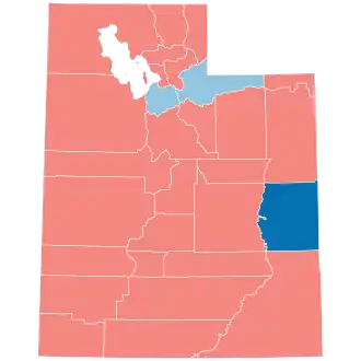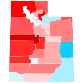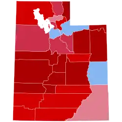 In 2020, Trump won Utah with 58.1% of the vote and a margin of 20.5%, which although an improvement on his 18.1% margin over Hillary Clinton in 2016, is still relatively narrow compared to the performance of past Republican nominees. He performed strongly in rural areas, as well as in some larger counties like Utah (Provo), Davis (Farmington), and Weber (Ogden). Trump improved over his 45.5% plurality win in 2016, due in part to the lack of a strong third-party presence, as Evan McMullin had earned 21.5% of the vote in 2016 but did not run in 2020; he endorsed Biden.[4][5] The election was far more of a two-party contest in 2020, with third parties receiving 4.2% of the vote, compared to 27% in 2016. Despite this, the Associated Press reported a less partisan and more cooperative cultural environment in Utah compared to other states during the election.[6]