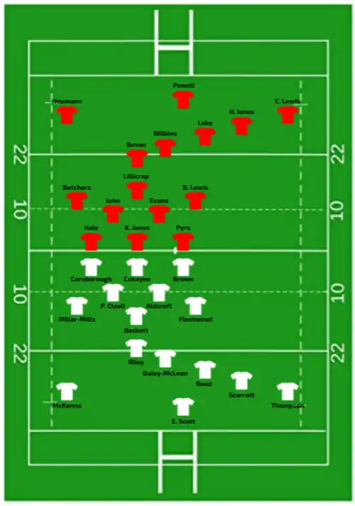 | 12:45 GMT (UTC±00:00) | Try: Hunter 4' c Dow 14' m Breach 27' m Fleetwood 40' m McKenna 59' m Con: Scarratt (1/5) 4' |
