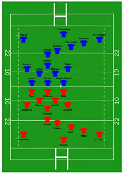 | 12:00 GMT (UTC±00:00) | Report | Try: Banet (2) 3' m, 37' c Sansus (2) 30' c, 51' m N'Diaye 47' c M. Ménager 63' c Annery 67' m Boudard 76' c Con: Trémoulière (5/8) 31', 39', 48', 64', 78' |