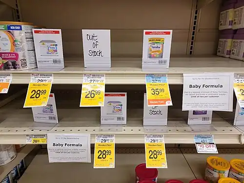 In 2022, the United States experienced a severe shortage of infant formula as a result of the 2021–2022 global supply chain crisis compounded by a large scale product recall.[82][83] As of May 14, nationwide out-of-stock rates were reported to be 43%, up from 31% two weeks prior; The Wall Street Journal states that the normal out-of-stock rate is 10%,[84] while other sources say that in the first half of 2021, out-of-stock rates were 2%-8%.[85] In many places, store shelves are bare. Delaware, Kansas, and Tennessee were the most hard-hit states.[84] As of mid-May, manufacturers and retailers expected a months-long delay before formula stocks would be fully restored.[86] In addition to infants, the formula recalls have affected non-infant medical patients who require nasogastric feeding.[87][88][89]