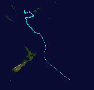 On December 13, Tropical Cyclone Ruby moved into the basin from the Australian region, as a Category 2 tropical cyclone on the Australian scale.[13][14] Late on the same day, it made landfall on New Caledonia, and weakened as it emerged from the country.[15] The FMS downgraded Ruby into a Category 1 tropical cyclone,[16] and the JTWC issued their final advisory shortly thereafter.[17] Ruby crossed into the MetService's area of responsibility, where it became an extratropical cyclone on December 15.[18]