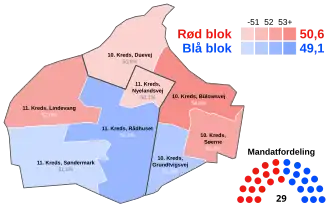 The result would see the Conservatives once again become the biggest party. However, for the first time in 112 years, it seemed as though they might lose the mayor's position. The traditional red bloc had won 15 seats and a majority. Only 416 votes had separated the two electoral alliances, in which the two blocs once again had entered. The Red–Green Alliance had become the biggest party of the red bloc, but it would be Michael Vindfeldt from the Social Democrats, who would become the new mayor, after an agreement was reached between themselves, the Social Liberals , the Green Left and Red–Green Alliance. This would mark the first time in 112 years that the Conservatives would not hold the mayor's position of the municipality.[7][8]