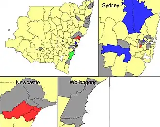 | Wollongong Independents | Gordon Bradbery | 38,741 | 30.4 | −4.7 | |