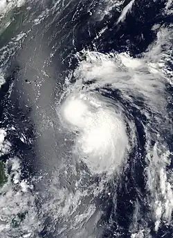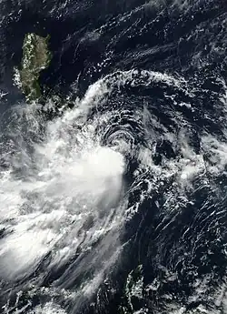 At 00:00 UTC on June 18, the JTWC started to monitor a broad area of convection nearly 250 km (160 mi) to the south-southwest of Pohnpei.[92] The system remained weak as it moved northwestwards in a favorable environment for further intensification, characterized by warm sea surface temperatures, low to moderate wind shear and good outflow; the disturbance remained weak as it moved northwestwards.[92][93] The JTWC issued a TCFA on the system two days later, though the system remained disorganized.[94][95] The JMA upgraded the system to a tropical depression at 00:00 UTC on June 21.[96] Meanwhile, the JTWC designated it as 06W in their first advisory on the system, with an exposed LLCC being evident on satellite imagery due to moderate wind shear, being induced by a tropical upper tropospheric trough to its north.[97][98] By 21:00 on June 21, 06W made its closest passage to the south-southwest of Guam, continuing its northwest track.[99][100] On June 22, at 06:00 UTC, the JTWC upgraded the system into a tropical storm as it continued to move away from Guam.[101] The JMA followed and upgraded the system into a tropical storm, in June 23 at 00:00 UTC, and assigned it the name Champi.[102] At 18:00 UTC, the JMA upgraded the storm to a severe tropical storm as it turned northwestwards.[103] At this time, a microwave imagery scan of Champi revealed an eye feature emerging in the system; however, this was short lived as dry air continued to impact the storm from the west.[104] In addition, poleward outflow on the system remained weak on June 24, restricting Champi to significantly develop.[105] However, on the next day, as a shortwave trough crossed the Ryukyu Islands, the outflow increased on the storm which allowed it to intensify further.[106] On June 25, at 06:00 UTC, the JMA officially declared the storm a typhoon.[107] The JTWC soon followed, upgrading it into a Category 1-equivalent typhoon.[108] At this time, a Champi turned north and north-northwestwards, and subsequently reached its peak intensity of 120 km/h (75 mph) ten-minute maximum sustained winds with a minimum barometric pressure of 980 hPa (28.94 inHg) by 21:00 UTC on June 25, however it was downgraded to a tropical storm a day later.[109] The storm continued to weaken as it move towards the Japanese islands, until on June 27, the JMA issued its last advisory at 12:00 UTC as the system became an extratropical low.[110] The JTWC also issued its last warning for Champi at 09:00 UTC, same day.[111]