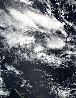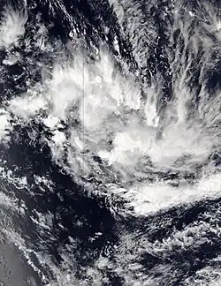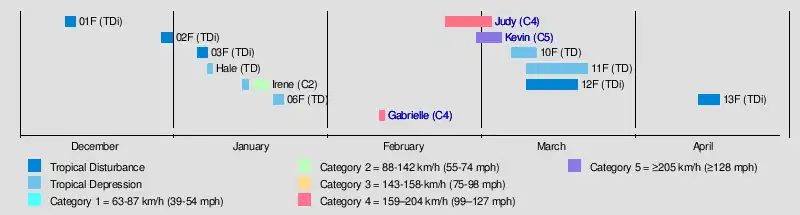 By early January 13, the FMS noted that a low pressure system was expected to develop to the west of Vanuatu in the next 5 days, and gave it a moderate chance of development.[36] However, the low formed in the Australian region late on the same day,[37] and by January 14, it organized into a tropical disturbance, with the FMS designating it as 05F.[38][39] 05F briefly entered the basin by the next day,[40] before subsequently moving back to the Australian region late by the same day.[41]