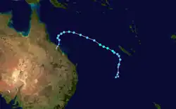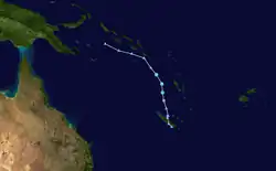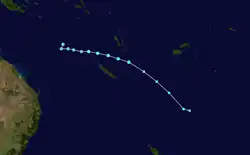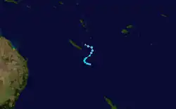 Late on January 5, the FMS reported that Tropical Disturbance 03F had formed near New Caledonia.[19] The system generally moved southeast before the FMS ceased advisories on the system, on January 7.[20] However, on January 8, the JTWC gave the system's chance for development, although in favorable environment, as low since it was in close proximity with Hale.[21] But upon reanalysis, convection re-fired, and an eye feature was visible,[21] although the JTWC later reported that the system had dissipated the following day.[22]