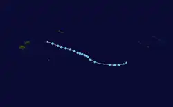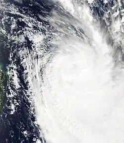 By January 17, 05F moved back into the South Pacific basin, where it was upgraded to a tropical depression by the FMS.[42] At 03:00 UTC on January 18, the JTWC's began issuing warnings on the system, classifying it as Tropical Cyclone 09P.[43] The FMS subsequently followed suit, upgrading the system into a Category 1 tropical cyclone on the Australian scale and naming it Irene.[44] At that time, satellite imagery showed Irene was quickly developing a central dense overcast (CDO).[45] Under a favorable environment of warm sea surface temperatures, low wind shear and strong poleward outflow,[46] Irene intensified into a Category 2 tropical cyclone late on the same day.[47] However, as it moved over Tanna Island in Vanuatu, its weakly defined and elongated low-level circulation center quickly became exposed due to the wind shear,[48] prompting the JTWC to issue its final warning on Irene and reclassify the system as a subtropical cyclone by January 19.[49] The FMS subsequently downgraded Irene into a Category 1 tropical cyclone,[50] and continued to issue warnings as it weakened while moving east-southeast, before declaring the system an extratropical cyclone late on the same day.[51] Irene was last noted the next day.[52]