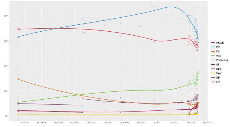 - ^ "CASTILLA Y LEÓN. Encuesta SigmaDos 25/06/2021: PODEMOS-EQUO 6,5% (2), PSOE 29,5% (28), UPL 2,2% (1), Cs 3,5%, XAV 0,5%, PP 43,8% (43), VOX 10,0% (7)". Electograph (in Spanish). 25 June 2021.