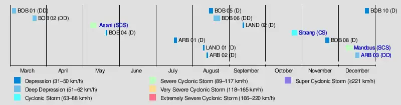 In late October, the IMD monitored an area of low pressure, which was designated as BOB 07 and later became Cyclonic Storm Sitrang, officially the second named storm of the season. The cyclonic storm abruptly headed north-northeast and early on October 24, it made landfall in Patuakhali, Bangladesh. Sitrang is the first tropical cyclone to hit Bangladesh since Cyclone Mora in 2017, and caused 35 fatalities. After Sitrang, Depression BOB 08 formed and struggled to consolidate a well-defined center before causing minor impacts to parts of southern India. In December, Deep Depression BOB 09 formed. IMD later upgraded it to Cyclonic Storm Mandous. Despite moderate easterly mid-level wind shear, Mandous intensified to a Severe Cyclonic Storm as it neared Sri Lanka. It made landfall near Chennai, India, as a Deep Depression and caused 9 deaths. The remnants of Mandous transferred across southern India and into the Arabian Sea. The system quickly developed and was designated as Depression ARB 03 by IMD. The storm unexpectedly rapidly developed and the JTWC designated it as Tropical Cyclone 07A, peaking with winds of 60 mph (95 km/h). After ARB 03, Depression BOB 10 formed and meandered in the Bay of Bengal before dissipating.