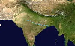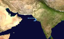 On 15 July, the JTWC started monitoring a disturbance west of Jafrabad, Gujarat, and it was unofficially designated as Invest 96A.[54] The disturbance substantially deepened, early on the next day, which prompted JTWC to upgrade it chance of formation to medium.[55] At 03:00 UTC of the same day, the IMD noted the disturbance and upgraded it to a tropical depression, becoming the first tropical depression of the season in the Arabian Sea.[56] It peaked as a depression, with maximum sustained wind speed of 25 kn (45 km/h; 30 mph) and a minimum barometric pressure of 992 hPa (29.29 inHg) after its initial stage of formation.[56] However, the system suffered from dry air intrusions as it moved away from the Indian coast.[57] By 18:00 UTC, the JTWC ceased tracking Invest 96A,[58] and on 18 July, the IMD issued its last warning, citing its weakening to a remnant low.[59]
