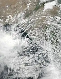 A monsoonal low spawned over the northwestern region of Bay of Bengal, off the West Bengal and Odisha coast on midday of 6 August, which later concentrated into a well-marked low pressure area on the next day.[60] By 9 August, it concentrated into a depression, after moving over coastal Odisha due to the incoming monsoonal trade winds.[61] It managed to maintain its intensity overland, until at 00:00 UTC (05:30 IST) of 10 August, it was downgraded to a remnant low over Chhattisgarh and adjoining east Madhya Pradesh.[62]