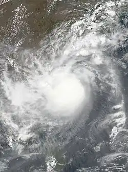 During the first week of May, a strong pulse of Madden-Julian Oscillation (MJO) and Equatorial Rossby wave (ERW) prevailed in this basin. These two conditions led to a cyclonic circulation forming over the southern Andaman Sea on 4 May. At the same time, a Westerly wind burst occurred on the same day which resulted in formation of twin cyclones over the either side of the Indian Ocean. The southern hemisphere counterpart being Tropical Cyclone Karim and the northern hemisphere counterpart being this cyclonic circulation.[25][26][27] The JTWC followed suit and designated it as Invest 92B on the next day.[28] On 6 May, under the influence of the same disturbance, a low pressure system formed off the coast of Andaman and Nicobar Islands.[29] Subsequently, the JTWC issued its TCFA, as it had rapidly consolidated its convective structure for the past few hours, along with development of a well-defined low-level center.[30] By the morning of 7 May, the system became more well-marked over the same region.[31] At 09:00 UTC (14:30 IST), the JTWC initiated advisories on the system and classified it as Tropical Cyclone 02B, while IMD followed the suit and upgraded it to Depression BOB 03.[32][33] Three hours later, the system was further upgraded to a deep depression status by the IMD, after forming a defined central dense overcast cloud pattern.[34] By 05:30 IST (00:00 UTC) of the next day, the system organized into Cyclonic Storm Asani, becoming the first cyclone of the season.[35] The name Asani was provided by Sri Lanka, which means wrath in Sinhala language.[36][37] Nine hours later, the JTWC upgraded it to a Category 1 status.[38] At 12:00 UTC (17:30 IST), the IMD further upgraded it to a severe cyclonic storm, as microwave imagery showed a well-organized system.[39] On 10 May, the cyclone began to encounter high wind shear due to which the JTWC downgraded it as a tropical storm while the IMD continue to maintain it as a severe cyclonic storm.[40][41] it began to make a sudden westward jog and mild decrease in wind shear made the JTWC to upgrade it again into a Category 1-equivalent tropical cyclone.[42] Nine hours later, Asani was further downgraded into a tropical storm, it began to weaken rapidly due to higher wind shear as well as dry air intrusion.[43] On 11 May, 12:00 UTC, Asani further weakened to a Deep Depression as it made landfall in the Indian State of Andhra Pradesh. The next day, the IMD issued its last advisory as the system degenerated into a low pressure area.