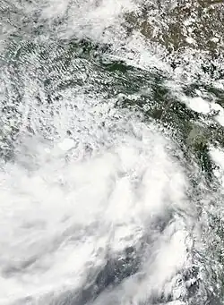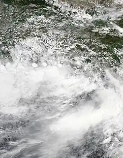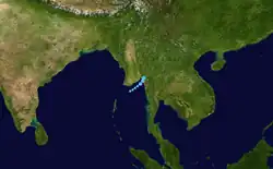 A fresh cyclonic circulation developed on early 19 May, over the Gulf of Martaban, due to the enhancement of the annual South-West monsoon over the basin.[44][45] By the evening, under the influence of that circulation, a low pressure system spawned over the same region.[45] At 18:00 UTC (23:30 IST), the JTWC also acknowledged that same circulation at the night of the same day.[46] By 00:30 UTC (06:00 IST) the JTWC published its TCFA for the system after it had rapidly consolidated its convective structure for the past few hours, and also formed a well-defined low-level center.[47] But eight hours later, the JTWC, cancelled it because its close proximity over land.[48] However, according to IMD, it rapidly consolidated into a well-marked low pressure area in the morning of the same day, and further into a depression at 11:30 IST (03:00 UTC), as it moved northeastwards, towards the south Burmese coast.[45] Between 08:00 UTC (13:30 IST) and 09:00 UTC (14:30 IST), the system made landfall over the southern Burmese coast, 30 km (20 mi) from Mawlamyine.[49] The system maintained its depression status as it travelled inland.[50][51] By 00:00 UTC (05:30 IST) the next day, the system finally weakened into a well-marked low pressure area over the Burma-Thailand.[52]