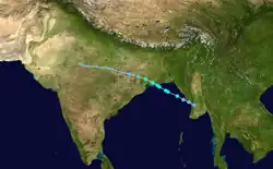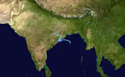 On 17 August, the JTWC recognized a newly formed low level circulation near Myanmar and designated it Invest 99B, which showed disorganized convective structure and an obscure low-level center.[79] By the next day, it developed into a low pressure area over northeastern Bay of Bengal and adjoining Bangladesh coast.[80] The JTWC unofficially released a TCFA for the system after its rapid development of its convective structure.[81] By the same day, at 21:00 UTC (02:30 IST), the JTWC unofficially declared it Tropical Cyclone 04B.[82] The IMD followed the same, and upgraded it to Depression BOB 06.[83] At 06:00 UTC (11:30 IST) on 19 August, BOB 06 further organized into a deep depression just off the coast of West Bengal and Bangladesh.[84] Shortly after intensifying, it made landfall close to Digha, West Bengal between 13:30 UTC and 14:30 UTC (19:00 IST and 20:00 IST) that same day.[85] At 21:00 UTC (02:30 IST), the JTWC issued its last advisory.[86] After landfall, the system continued to track west-northwestwards, eventually weakening into a depression on 21 August over northeastern Madhya Pradesh and southeastern Uttar Pradesh.[87][88] The system persisted for another two days until 23 August, when it weakened into a well-marked low pressure area over eastern Rajasthan and adjoining northwestern Madhya Pradesh.[89]
