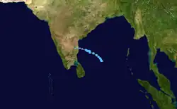 The Indian Meteorological Department issued a bulletin stating that a tropical depression had formed in the Bay of Bengal and was designated BOB 09.[118] The JTWC, released a TCFA on the system, stating that it could intensify further, because of very warm waters and low to moderate wind shear, designating it Invest 96B.[119] A day later, both the JTWC and IMD classified this low pressure as a "cyclonic storm" and it was named Mandous.[120][121] Mandous continued tracking westward, attaining wind speeds of 95 km/h (59 mph), thus strengthening into a Severe Cyclonic Storm.[122][123] As it continued tracking westward, land interaction caused in to fall to Cyclonic Storm intensity. It later made landfall around Chennai, India as a Deep Depression. It fell to Depression intensity and later degenerated into a remnant low.[124]