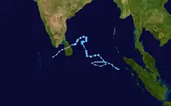 On 22 December, the JTWC began tracking a disturbance near Sumatra. It traveled westward before conducting an anticyclonic loop. It traveled north, then west, then north again. By this time, the IMD had already recognized it as a Depression, designating it as BOB 10, while the JTWC designated it as Invest 98B. The JTWC and the IMD assessed BOB 10 and gave it a low chance to develop into a tropical cyclone due to a broad LLC (Low Level Circulation) partially exposed to the southeast of flaring convection that is being sheared to the northwest, and marginally favorable environment.[133] On 25 December, the system weakened further as it approaches the coast of India being a remnant low. The JTWC was still tracking the system, and it made landfall in Northeastern Sri Lanka. The JTWC still gave it a low chance for tropical development, while the IMD said it couldn't develop further.[134] The storm continued to weaken and dissipated southwest of Sri Lanka on 27 December.