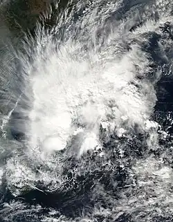 After the dissipation of Land Depression 01, a sudden surge of equatorial Rossby Waves and Kelvin Waves prevailed over the basin.[63] These two waves helped in a formation of another monsoonal low over Saurashtra and adjoining northeastern Arabian Sea on 10 August,[64] which later concentrated into a well-marked low pressure on 12 August.[65] The JTWC, on the same day, designated it as Invest 98A.[66] By 12 August, favorable conditions like high sea-surface temperature (SST), moderate wind shear and a strong pulse of MJO, helped for further concentration into a depression, but its center was sheared due to wind shear.[67] The JTWC soon followed the suit and upgraded it to Tropical Cyclone 03A.[68] However, as it moved westwards away from the Indian coastline, the wind shear increased significantly, which decayed its convective structure.[69][70] At 03:00 UTC (08:30 IST), the JTWC ceased issuing advisories to the system.[70] Nine hours later, the IMD followed the same, and downgraded the system to a remnant low.[71]